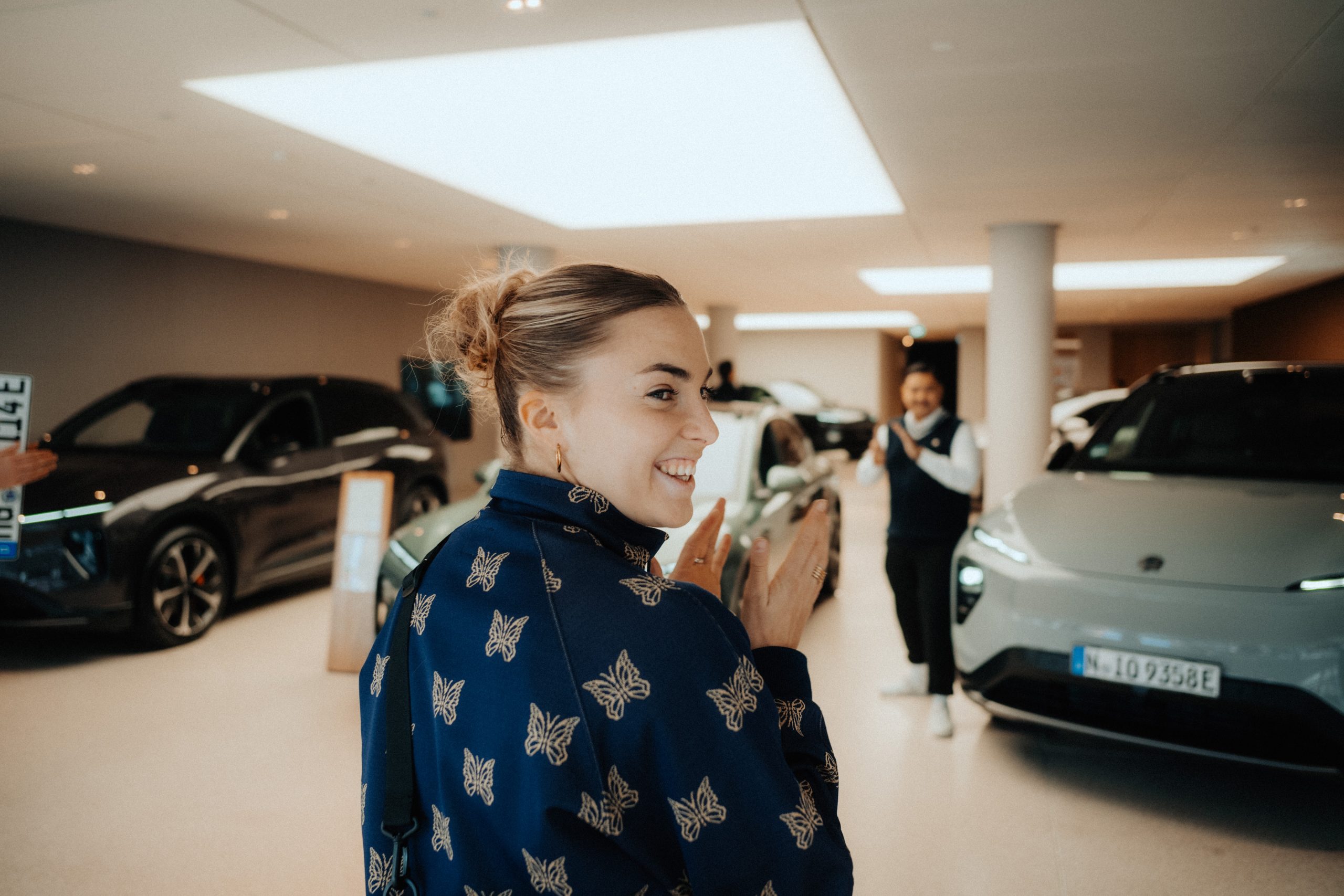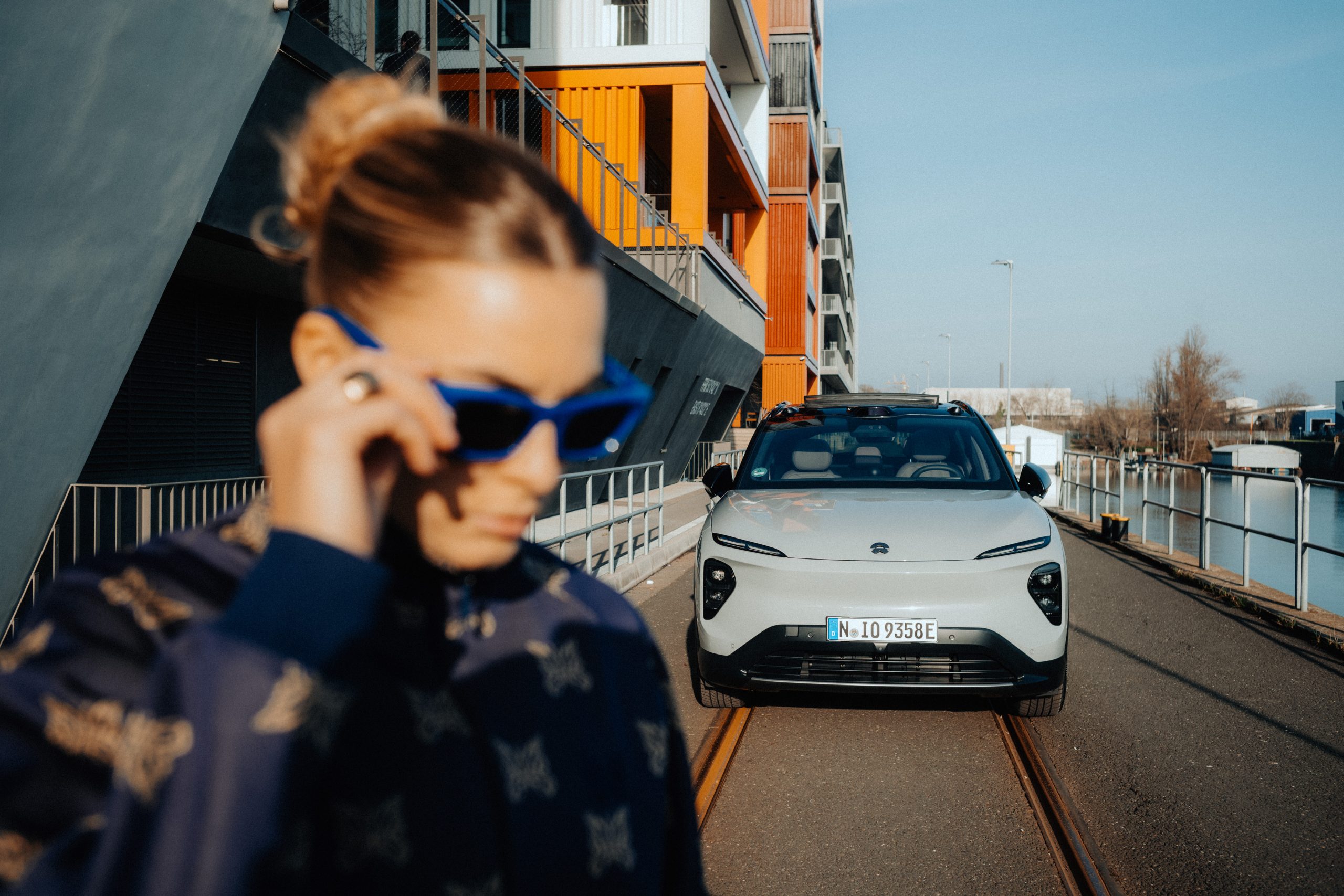 Our shoot took place in the heart of downtown Frankfurt and by the waterfront – blending urban architecture with the elegance of NIO’s new model. The aim: to capture Laura’s authentic excitement as she received her new vehicle, and to create high-quality brand visuals for both social media and press coverage.